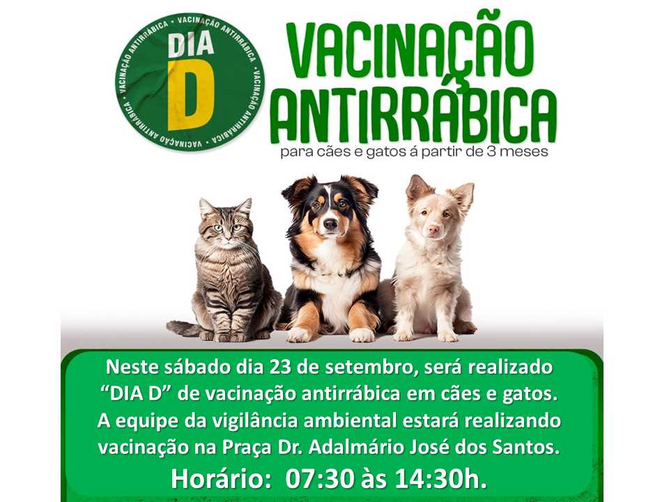 Neste sábado dia 23 de setembro, será realizado ?DIA D? de vacinação antirrábica em cães e gatos. A equipe da vigilância ambiental estará realizando vacinação n...