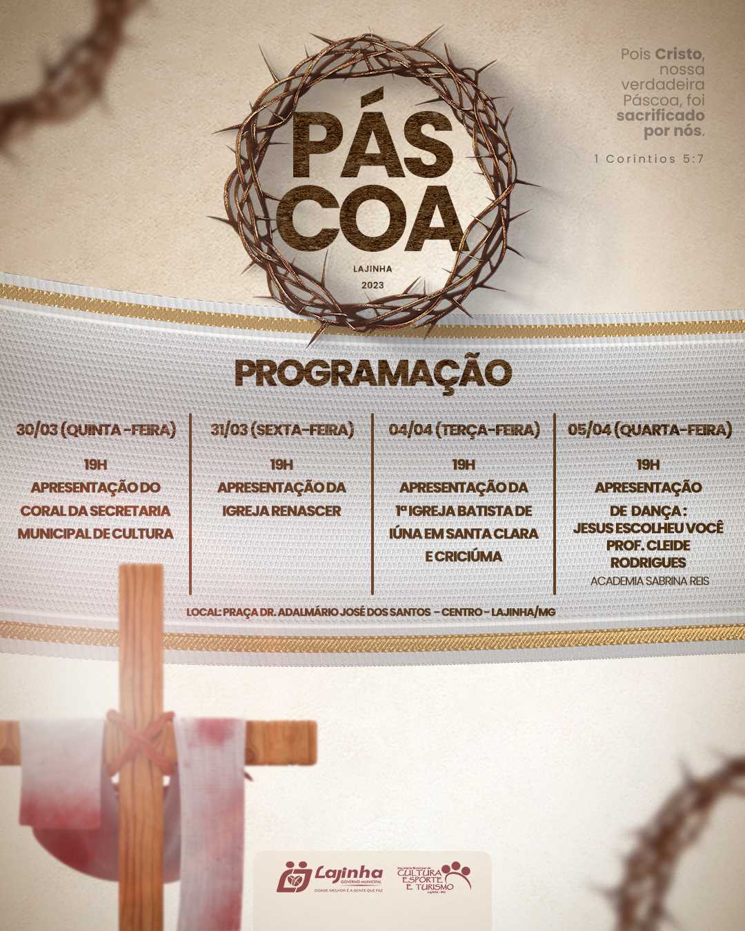 LOCAL: PRAÇA DR. ADALMÁRIO JOSÉ DOS SANTOS - CENTRO - LAJINHA/MG 30/03 (quinta-feira) ABERTURA 19H - APRESENTAÇÃO DO CORAL DA SECRETÁRIA MUNICIPAL DE CULTURA 31...